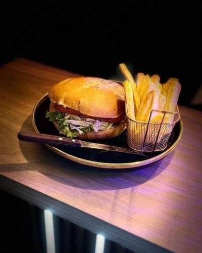 Pollo jugoso en pan crocante, acompañado de papas fritas.